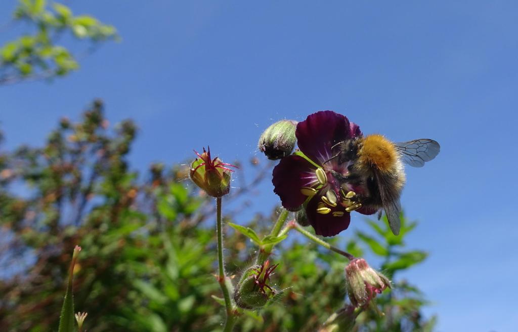 On the first of June, on what was probably the warmest day of the year in Edinburgh so far, I went outside to look for insects. Due to the lovely weather, there were lots of active bees visiting flowers. My experience of photographing bees is that it is very hit and miss. The trick is to just snap away and accept that most of the pictures will be deleted. One great advantage of digital photography is that you can be extravagant in shooting. After several fails, I managed to shoot this image of a common carder bee visiting the flower of a dusky crane’s-bill. The sharpness and composition are purely luck, you don’t have time to think about composing the picture. Just shoot away and hopefully something will please you.